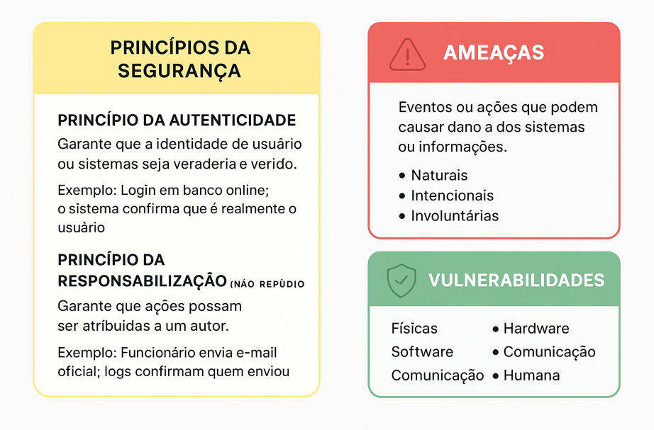 | Princípio da Autenticidade | Garante que a identidade de usuários ou sistemas seja verdadeira e verificável | Login em banco online; o sistema confirma que é realmente o usuário |