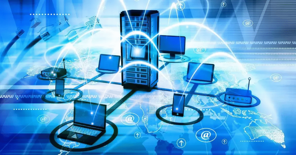 Uma rede de computadores conjunto de dispositivos interligados — como computadores, servidores, switches, roteadores e smartphones — que compartilham informações, recursos e serviços por meio de algum tipo de comunicação, geralmente usando cabos ou conexões sem fio.